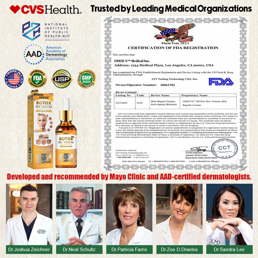 "As a dermatologist, I’ve always been passionate about finding effective, natural solutions for skin problems. After extensive research and testing with my lab team, and clinical trials involving over 2,000 participants, I discovered that bee venom is a powerful natural ingredient for addressing a wide range of skin concerns. This led me to create the ODEIUN™ BOTOX Bee Venom Anti-Aging Serum —an all-in-one solution designed to naturally and effectively relieve multiple skin issues with precision." - Dr. Doris Day Dermatology