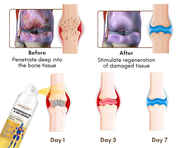 ODALIT™ Magnesium Oil & Bee Venom Joint Healing Spray is a fast-absorbing, non-greasy formula crafted to relieve joint pain naturally and effectively. Enriched with therapeutic-grade magnesium oil to support bone health and potent bee venom to reduce inflammation, ODALIT™ penetrates deep to ease swelling, restore flexibility, and improve joint function—without sticky residue or harsh chemicals.